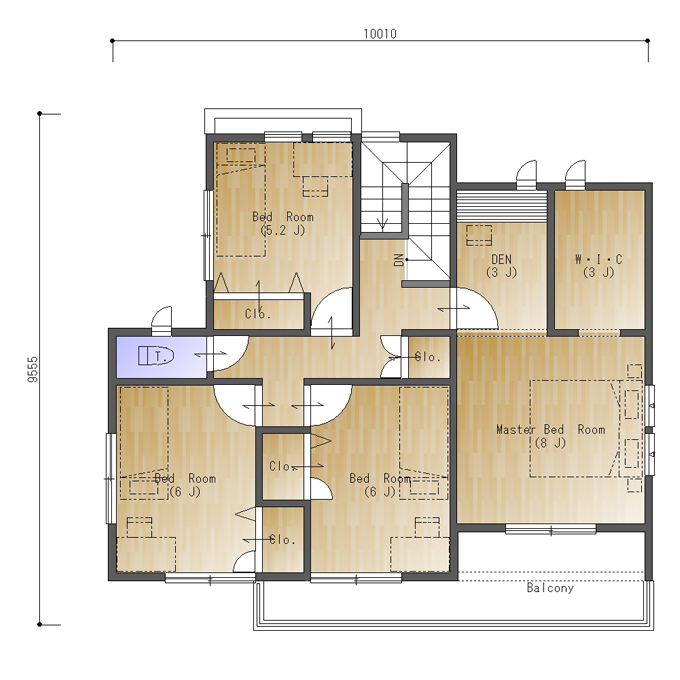 2階は充実の4部屋。主寝室は8帖で、さらに各3帖のウォークインクロゼットと書斎スペースがついています。角部屋2室と中央の1室にはすべてクロゼットがついており、収納量としては問題ありません。