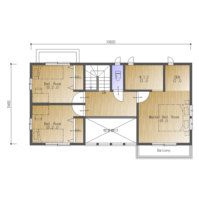 2階の2つの子供部屋はいずれも角部屋で通風・採光の良い環境になっています。主寝室は8帖あり、その奥には3帖のウォークインクロゼットと2帖の書斎があります。主寝室の南側にはバルコニーがあり、お部屋を明るく照らしてくれます。