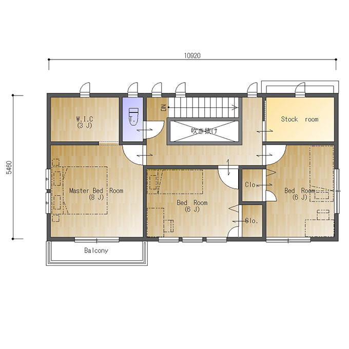 2階の主寝室は8帖あり、南側にバルコニー、西側にも窓があるので、採光性と通気性に優れています。また主寝室の奥には3帖のウォークインクロゼットがついています。2つある6帖の子ども部屋は互い違いに組み合わさった収納を挟んでいるため、プライベートを損なわないように配慮がされています。さらに、2階には3帖ほどのストックルームがあるので、家族の荷物をしっかり収納できます。