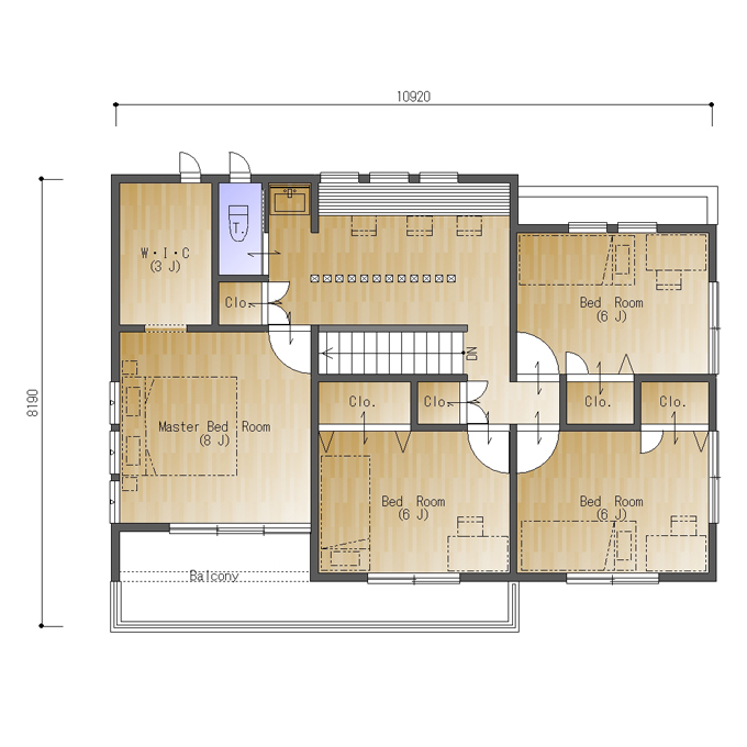 2階の主寝室は8帖で、奥には3帖のウォークインクロゼットがついています。主寝室と1つの子供部屋は南側のバルコニーに面しているため、明るい光が取り込めます。他の2つの子供部屋はいずれも角部屋で、採光性・通気性に優れています。北側の階段脇には広めのワークスペースがあり、お子さんの勉強やリモートワークにも活用できそうです。