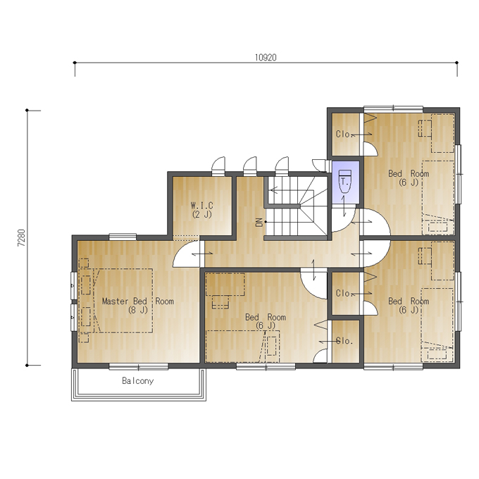 2階にある4部屋のうち3部屋は角部屋で、採光性・通気性に優れています。真ん中の部屋も南側に窓があり、明るい光がふりそそぎます。8帖の主寝室には、バルコニーと2帖のウォークインクロゼットがついています。