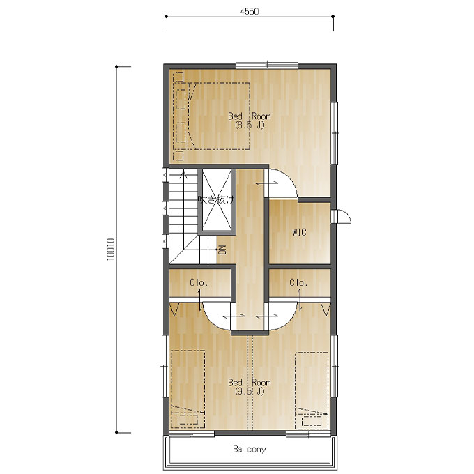 二階は各部屋にしっかり収納がついた三部屋を配置。