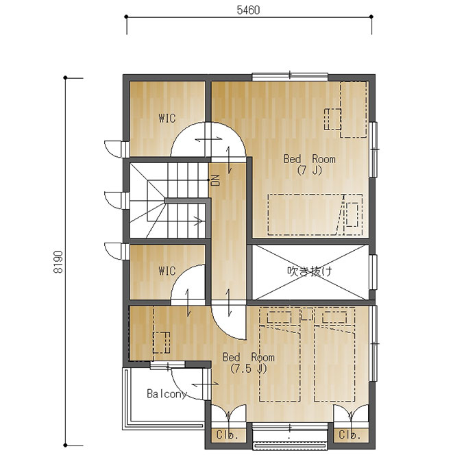 二階はゆとりのある二部屋。北側の寝室には一坪のクローゼット、南側の主寝室にはクローゼットと書斎コーナー、バルコニーを設けています。建物の表情にアクセントを加えるために南側に小さな収納を設けていますが、これは飾り棚でもいいかもしれません。