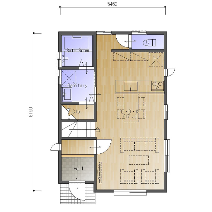 南玄関、東西の間口3.0間(5460㎜)、南北の奥行が4.5間(8190㎜)の参考プランです。