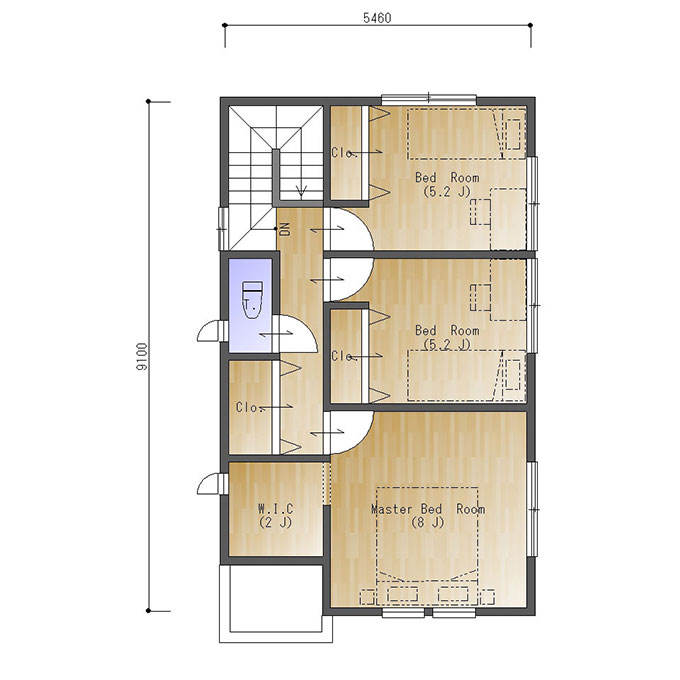 南玄関、東西の間口3.0間(5460㎜)、南北の奥行が5.0間(9100㎜)の参考プランです。