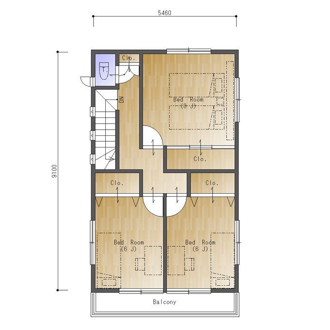 南玄関、東西の間口3.0間(5460㎜)、南北の奥行が5.0間(9100㎜)の参考プランです。