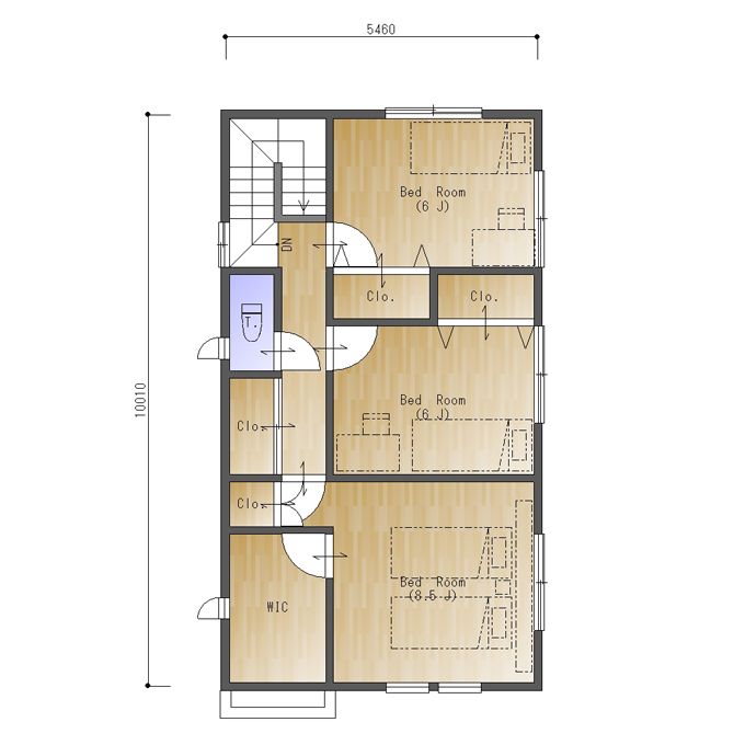 南玄関、東西の間口3.0間(5460㎜)、南北の奥行が5.5間(10010㎜)の参考プランです。