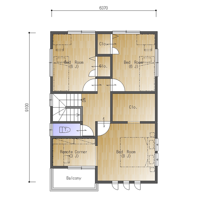 主寝室はしっかり8帖。バルコニーに近い日当たりの良いところに3帖大のリモートコーナーを配置しました。日当たりの良いところで気持ちよく仕事ができます。疲れたらバルコニーでちょっと背伸びをして休憩もできますね。
