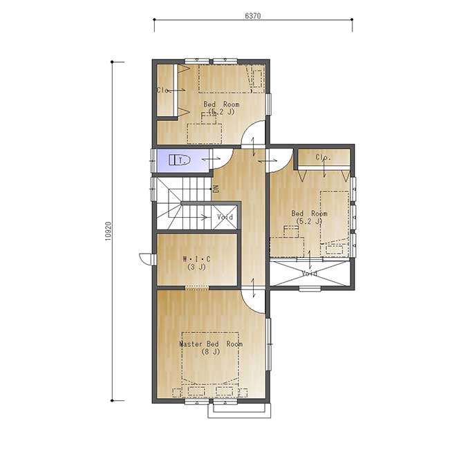 二階は凸字型に部屋を配置していますが、スペースに無駄が無いよう中央に廊下を配置し、主寝室は8帖、このほかウォークインクロゼットも3帖あります。