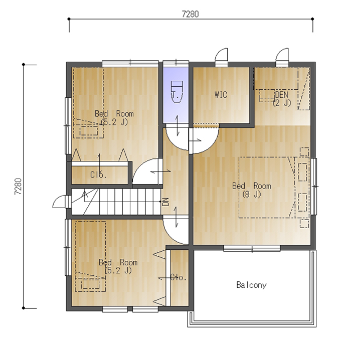 まず目に入るのは主寝室前の大きなバルコニーではないでしょうか?大きさは5帖あります。このプランではバルコニーに天井を設けていませんが、容積率に問題がなければすっぽり屋根をかけてしまえば主寝室のアウトリビングになるスペースです。季節のいいお休みの日はここでテーブルをだして楽しむのもいいかもしれませんね。ウォークインクロゼット、書斎もついています。