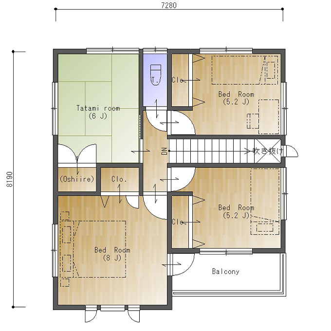 二階はできるだけ大きな部屋が多く取れるようにホールを小さくした間取りです。