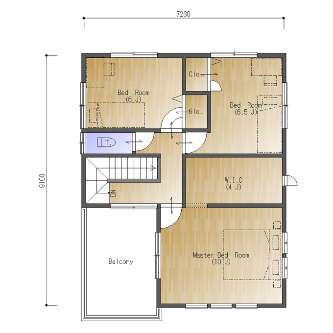 主寝室は10帖とゆったり、3帖のウォークインクロゼットもついていて正面には6帖大のバルコニーが。階段ホールからもでられる家族みんなでつかえる大きなバルコニーです。屋根をかけてセカンドリビングにしてもいいでしょう。