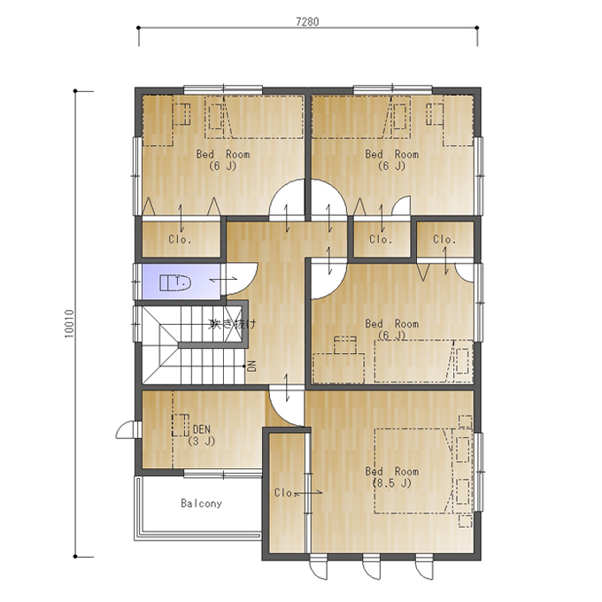 南玄関、東西の間口4.0間(7280㎜)、南北の奥行が5.5間(10010㎜)の参考プランです。
