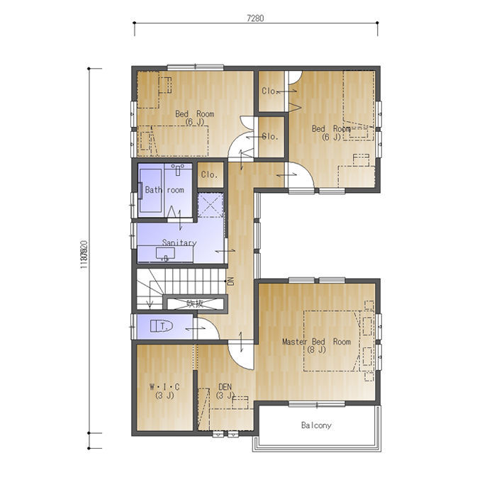 二階のレイアウトは階段のレイアウトを少し変えて吹き抜けがあります。主寝室も大きなバルコニーと書斎、ウォークインクロゼットも充実している邸宅です。