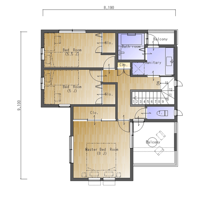 南玄関、東西の間口4.5間(8190㎜)、南北の奥行が5.0間(9100㎜)の参考プランです。