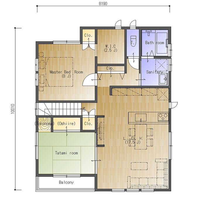 南玄関、東西の間口4.5間(8190㎜)、南北の奥行が5.5間(10010㎜)の参考プランです。
