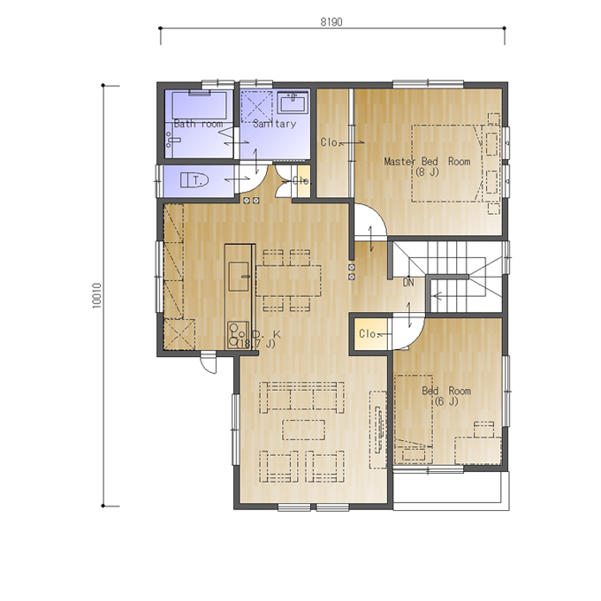 南玄関、東西の間口4.5間(8190㎜)、南北の奥行が5.5間(10010㎜)の参考プランです。