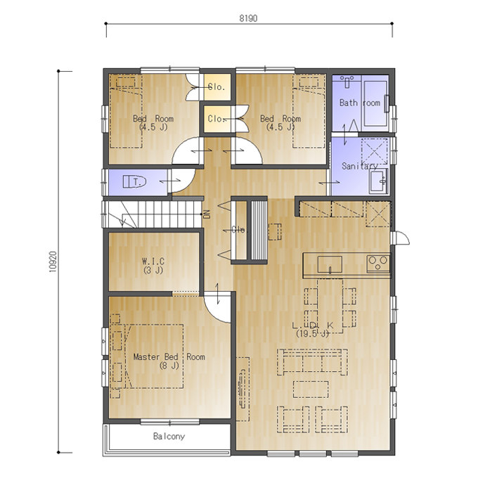 二階は19.5帖のLDKに8帖の主寝室と4.5帖の子供部屋が二つ。水回りはできるだけ上下階で近い位置に配置して配管がシンプルになるよう配慮しました。