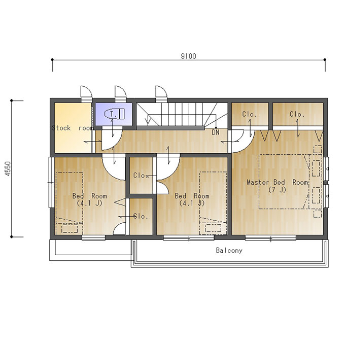 二階は三部屋なので子供室を4畳半に抑えました。でも部屋の間に互い違いになった収納を挟んで、将来的に一部屋にすることもできる配置です。