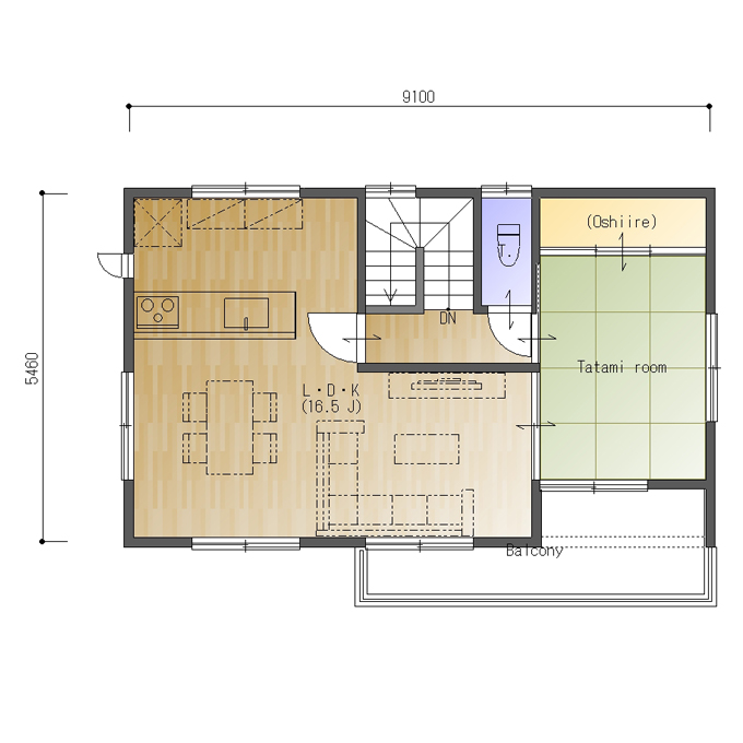 東西の間口が5.0間(9100㎜)、南北の奥行が3.0間(5460㎜)の南玄関の参考プランです。