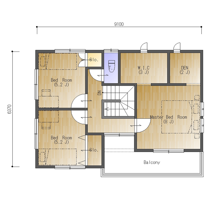 二階は三部屋。主寝室が主役になるようにプランニングしてあります。3帖のウォークインクロゼットのほか書斎、バルコニーは奥深く間口も3間とダイナミックな広さになっており階段ホールからもアクセスできます。