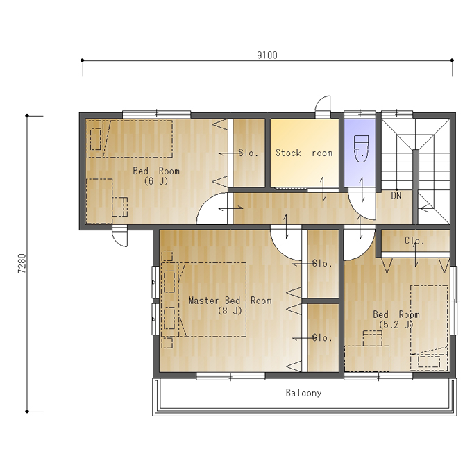 南玄関、東西の間口5.0間(9100㎜)、南北の奥行が3.5間(6370㎜)の参考プランです。