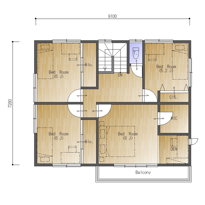 二階は四部屋で、お子さんが三人いる大家族向きの間取りです。それでも主寝室にはウォークインクロゼットと書斎がついています。子供部屋はいずれも角部屋で通風・採光に配慮しました。どれもが明るい子供部屋です。