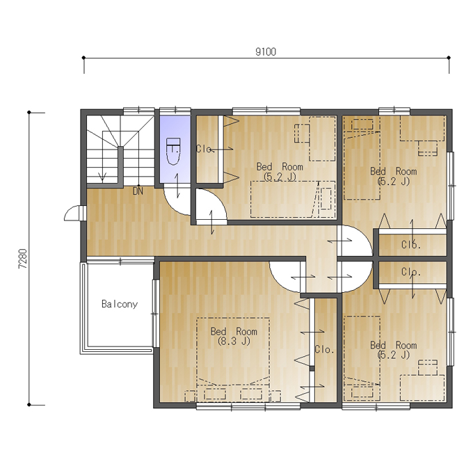 二階は四部屋。子供部屋をホールを中心に三部屋配置して南側のバルコニーのある場所に8帖大の主寝室を持ってきました。バルコニーの部分は子供たちの共有の勉強コーナーにしてもいいかもしれませんね。