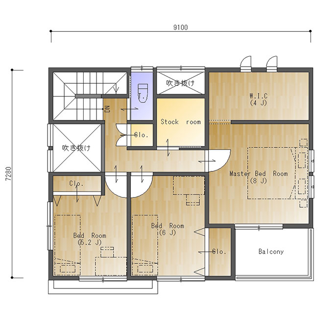 二階は三部屋。納戸のほか、余剰スペースを利用した日用品が収納できる半畳のクロゼットまであります。掃除機など日ごろよく使うものを収納するのにおススメです。主寝室には4帖のウォークインクロゼットがあるほか、目の前に奥行のあるバルコニーが。休日はここでゆっくりすごしてください。