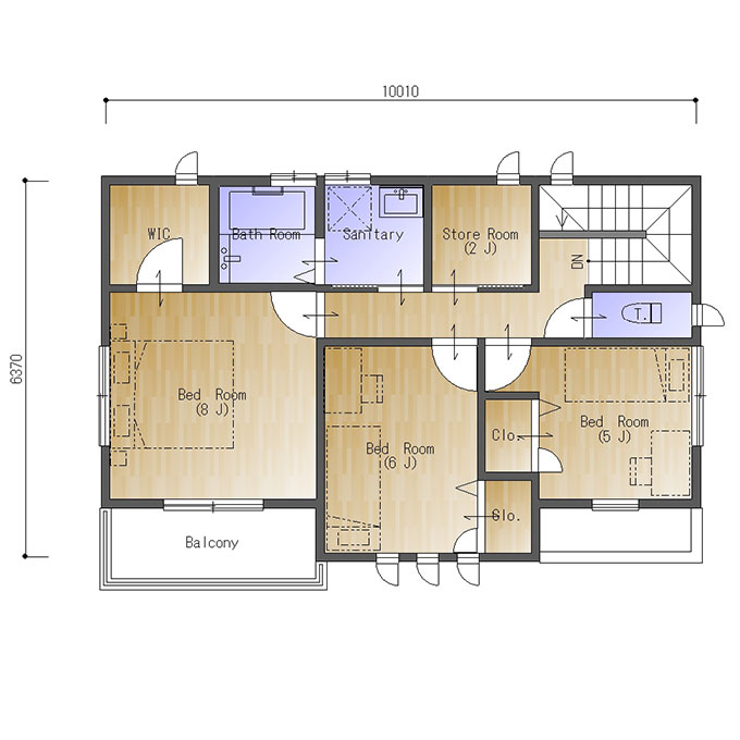 東西の間口5.5間(10010㎜)、南北の奥行が3.5間(6370㎜)の南玄関の参考プランです。