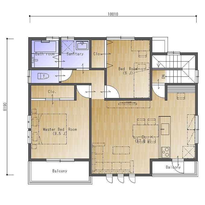 南玄関、東西の間口5.5間(10010㎜)、南北の奥行が4.5間(8190㎜)の参考プランです。
