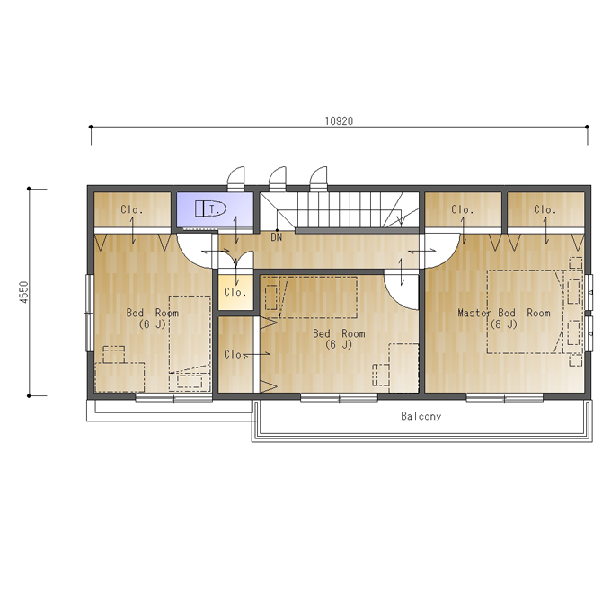 二階の主寝室を充実させた間取りです。子供部屋を5帖ずつの南北に分けたタイプにしました、5帖でもそれぞれが角部屋なので通風・採光は良好、家具の配置もしやすく狭さを感じません。