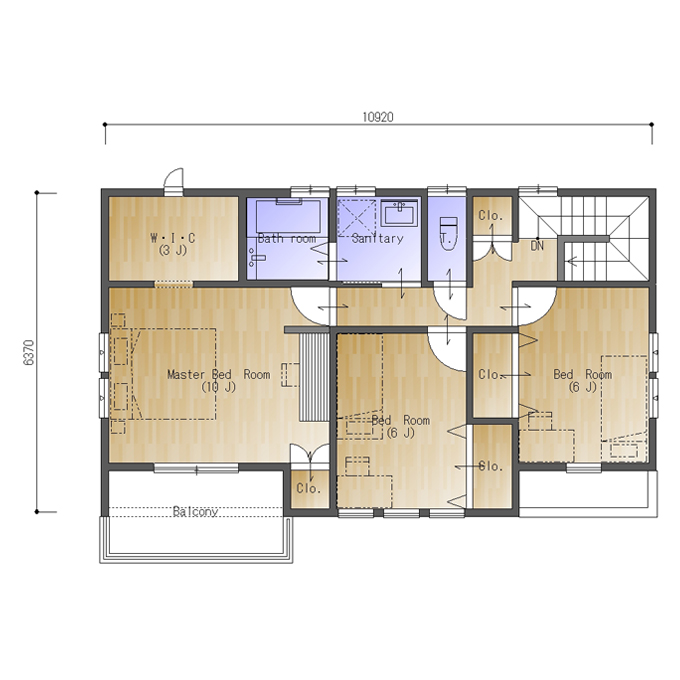 一階を広くとった分二階に水回りをもってきました。就寝前にお風呂に入るには便利な位置です。子供部屋は収納を挟んで隣り合わせになっています。片方は角部屋ですが真中の部屋は開口部を多くとることで閉塞感がでないようにしています。入り口から細長い真中の部屋になる6帖は広く開口部をとったほうがベターです。