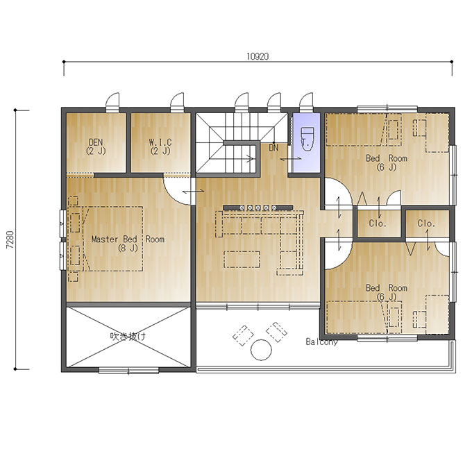 主寝室から吹き抜けを通じて一階ダイニングにつながっています。ここは障子などで仕切ると主寝室に南の明るさが入ってきます。
