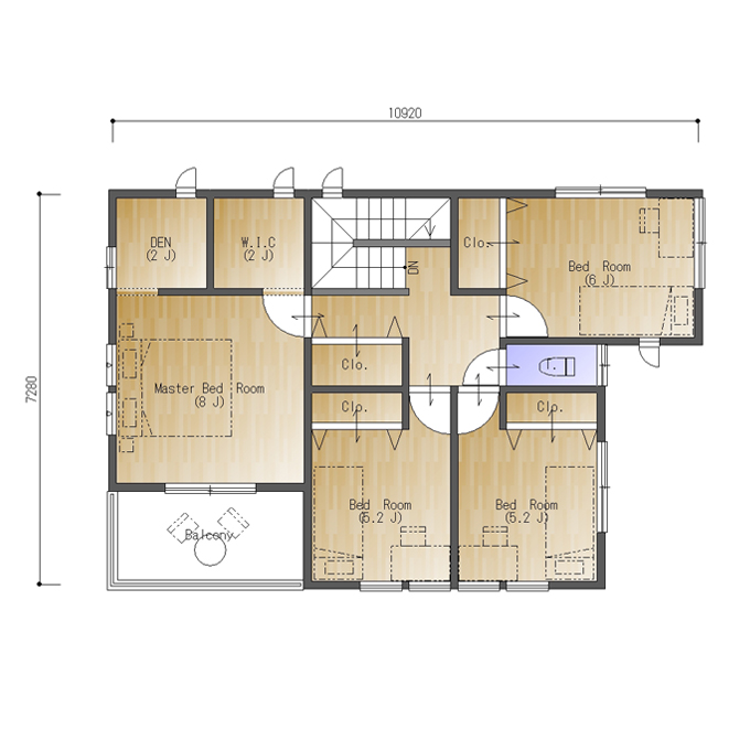 二階は四部屋、子供部屋を近づけて将来間仕切りを取って大きな部屋にしやすいようにレイアウトしています。主寝室も8帖、ウォークインクロゼットと書斎がついています。