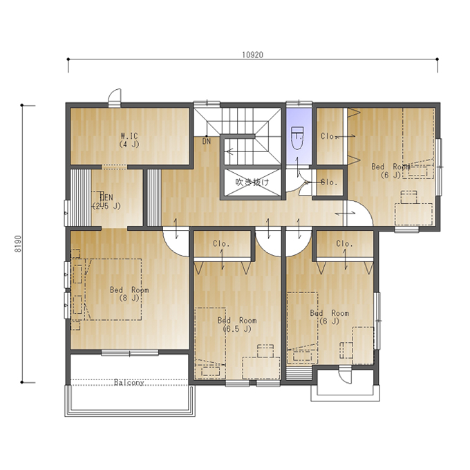 二階は四部屋、子供室ゾーンと主寝室のゾーンを分けました。主寝室は8帖、こちらはウォークインクロゼットと書斎がついていて、さらにプライベートバルコニーもついています。開放感のある主寝室ですね。
