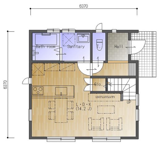 【間取り・注文住宅プラン】廊下を減らし、浴室と洗面所を二階にしたことで一階部分の居住空間を広く取った間取り