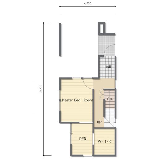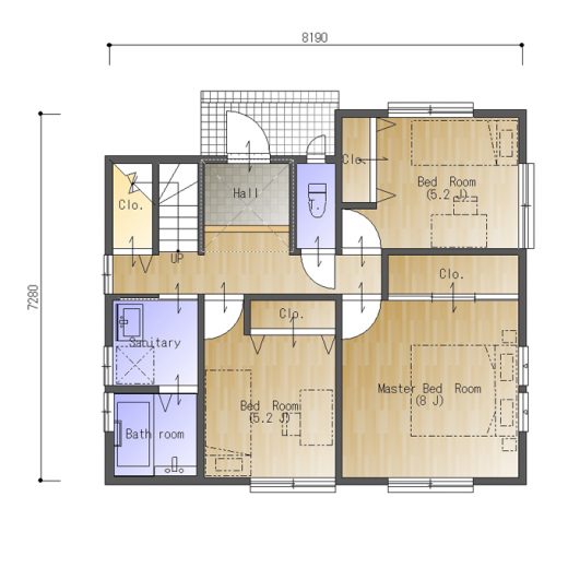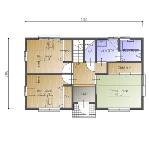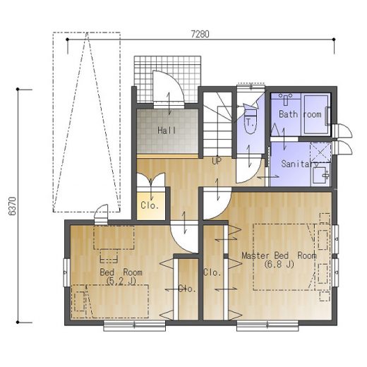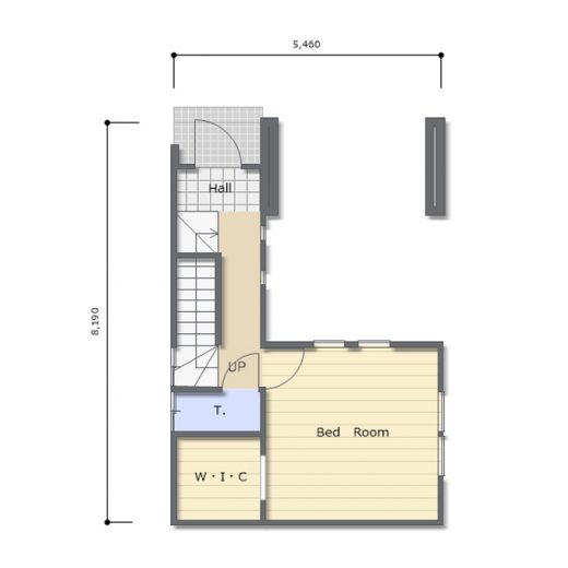 【間取り・注文住宅プラン】一階に寝室、洗面所と浴室、二階にLDKを配置した2LDKの間取り