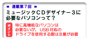 なお、最近では簡単に接続が行なえるUSB対応のCD-R/RWドライブが普及していますが、このようなドライブを使用する場合CPUは、200MHz以上のPentiumプロセッサが必要です。また、ハードディスク空き容量は、作成するCDのデータを保存しておく場合、80分の音楽データでは約800MBが必要です。