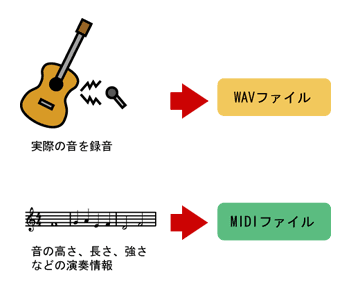わかりやすく例えると、オーディオデータが「カセットテープに録音された情報」とすると、MIDIデータは「楽譜に記述された情報」といった違いがあります。