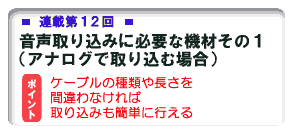 また、ほとんどのポータブルMDプレイヤーには、デジタル出力端子は装備されていません。このような場合はアナログでしか取り込めないので、ラジカセなどのときと同じように、MDプレイヤーのライン出力端子をパソコンのライン入力端子に接続します。