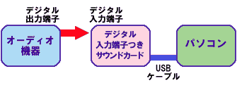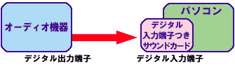 デジタルの取り込みのメリットは、電気的なノイズの混入を心配することなく取り込みが行なえることです。また、ミュージックCDデザイナー3はサンプリング周波数の自動検出機構(44.1/48KHz)を搭載しているので、取り込み時の切り替え設定を気にする必要はありません。