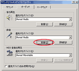 ●[録音コントロール]ウィンドウは、[サウンドとマルチメディア]コントロールパネルの[オーディオ]タブにある録音の[音量]ボタンをクリックすると表示されます。