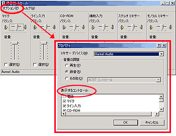 「S/P DIFイン」が表示されていない場合は、[録音コントロール]ウィンドウの[オプション]メニューから[プロパティ]を開き、「表示するコントロール」で「S/P
