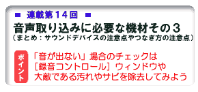 オーディオ機器とパソコンを接続して取り込みを行なってみると、音が出ていないということがあります。このような場合、まずソース側のオーディオ機器の出力端子と、パソコンの入力端子が正しく接続されているかを確認しましょう。