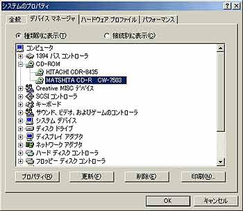 CD-R/RWドライブが正しく動作しているかの確認は、コントロールパネルの[システム]のプロパティを開き、[デバイスマネージャ]タブをクリック。「CD-ROM」のアイコンをダブルクリックするとその下に接続しているCD-R/RWドライブのアイコンが表示されるので、正常に動作しているかどうかを確認します。