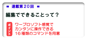 ワープロソフトでの文書作成・編集では「切り取り」「コピー」「貼り付け」といった操作を行なったり段落を区切ったりして文書が読みやすいように体裁を整えたりしますが、音楽CD作成の編集も同様に、曲(トラック)に対して様々な音響効果(エフェクト)を施すことで聴きやすくしたり、曲の一部をカットしたり繰り返したりあるいは複数の曲を重ねることで演出効果を加えたりといったことが行なえます。