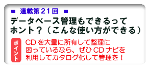 例えば上記のように、どのCDにどんな曲が入っているのか調べるには、[CDナビ]ウィンドウ左側の[検索条件の追加]で検索条件を指定した後[検索]ボタンをクリックすると左下のCD情報リストに検索結果のCD情報が表示されます。さらに、それをクリックすると画面右下のトラック情報リストに収録されたトラック情報が表示されます。
