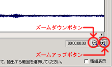 波形グラフの基本的な操作は、後ほど紹介しますが、さきにひとつ、重要な機能について紹介しておきましょう。それは、ズームボタンによる拡大/縮小表示の機能です。というのも、非常に短い時間や、時間的に高い精度が要求されるの編集作業を行う際には、これらのボタンを活用することで非常に便利になるためです。