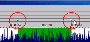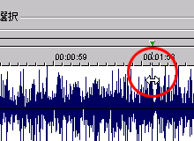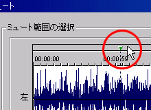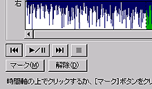 もうひとつの方法が、試聴中に[マーク]ボタンをクリックする方法です。試聴方法に関しては後ほど説明しますが、試聴を行っている途中に、試聴用の操作ボタンの下にある[マーク]ボタンをクリックすると、クリックした時点で再生されていた位置(点滅する縦線のあった位置)に、選択箇所が指定されます。